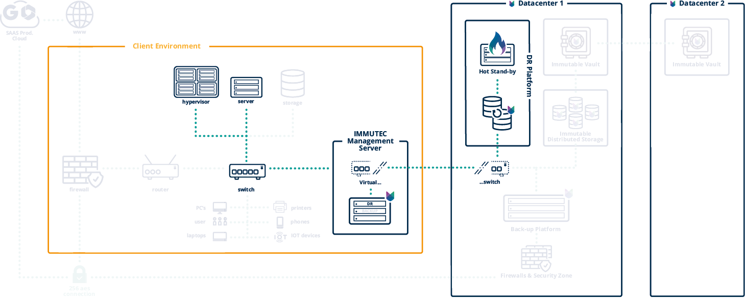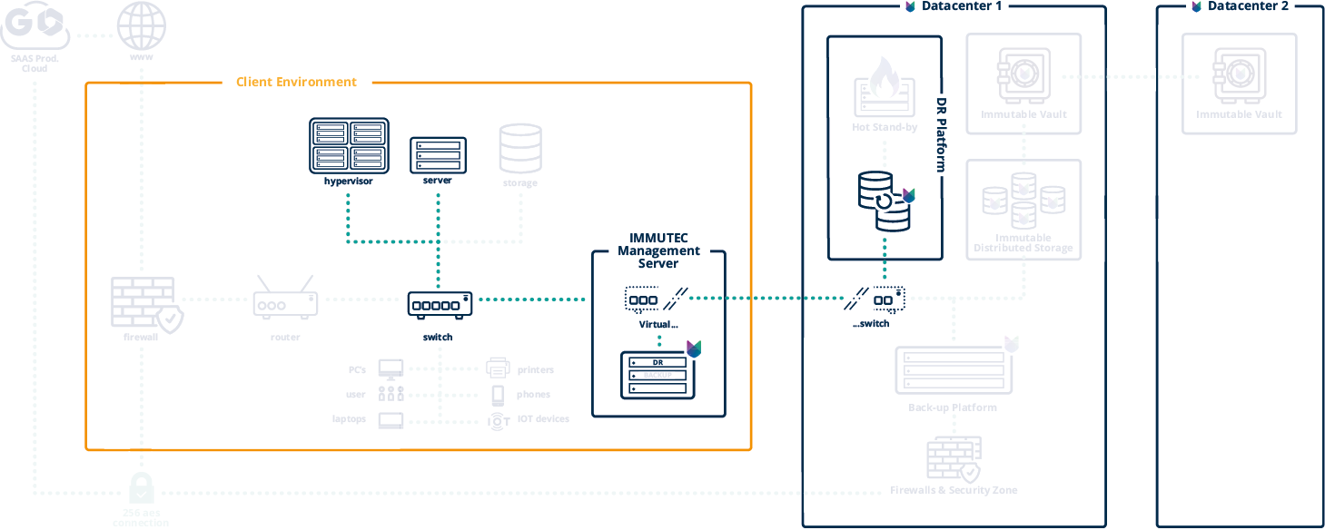 Met de unieke IMMUTEC Proxy server lijkt het voor jouw servers, applicaties en werkstations alsof je nog op de operationele omgeving werkt. In werkelijkheid ben je verbonden met jouw continuïteitsomgeving bij IMMUTEC (Disaster Recovery). Deze omgeving wordt voor jou vanuit het datacenter gefaciliteerd (DRAAS) of vanuit de Public cloud (Azure, AWS).